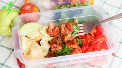 Когда перекус или обед на работу «что под руку попало» все чаще становится закономерностью, а бутерброды и салатики из ближайшей кулинарии определенно поднадоели…. Попробуем отделиться от общепринятых офисных канонов. Долой банальную лень! Здравствуй, время для правильного питания и заботы о себе! К тому же, обед из дома полезнее и дешевле еды из кафешки. Ланч-бокс – такой себе обеденный «чемоданчик», настоящая палочка-выручалочка для тех, кто худеет (порцию ведь можно контролировать) или решил питаться здоровой пищей. Предлагаем еще один вариант приготовления полезного домашнего «обеда в ланч-боксе». Диетического и аппетитного. Выход – 2 порции. Ингредиенты: КБЖУ на 100 грамм: 51.25/7.34/0.45/4 Как сделать обед на работу: Куриное филе порежьте небольшими кусочками. Сложите в посуду. Добавьте к мясу томатный соус. Специи, черный перец и паприку – по вкусу. Хорошо перемешайте. Оставьте на 30–40 минут. Пока филе пропитывается специями, кабачок нарежьте пластинами, морковь – колечками. Пе