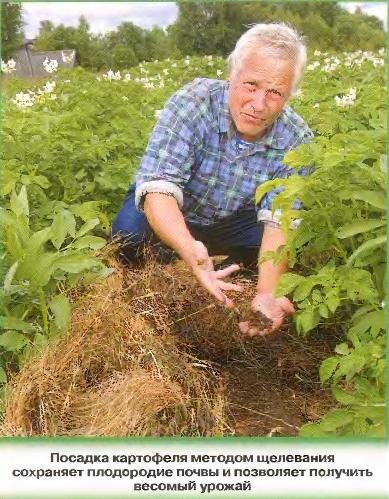 Мы с женой пенсионеры. Денег на покупку необходимого количества навоза у нас нет, перекапывать огород в 12 соток нам давно не под силу и помогать особо некому. Выручает система органического земледелия — без перекопки и пестицидов. Благодаря ей ежегодно полностью обеспечиваем себя основными овощами, да еще и излишки образуются. Расскажу, в чем заключается суть нашего метода. Почва в огороде весь сезон покрыта мульчей из травы, опавших листьев, сена или соломы. Дополнительно укладываем мульчу после высадки рассады и клубней и окучивания рядков. Осенью перекапываем участок, удаляем многолетние сорняки и укрываем почву мульчей. Под ней огород остается в зиму. Весной грядки для всех культур готовим за две-три недели до высадки растений: граблями сдвигаем мульчу и тяпкой срезаем всходы сорняков, преимущественно однолетних. Картофель выращиваем методом щелевания: лопатой вдоль натянутого через 70, 90 или 120 см шнура делаем узкие (шириной около 10-15 см) траншеи-щели, в которые высаживаем