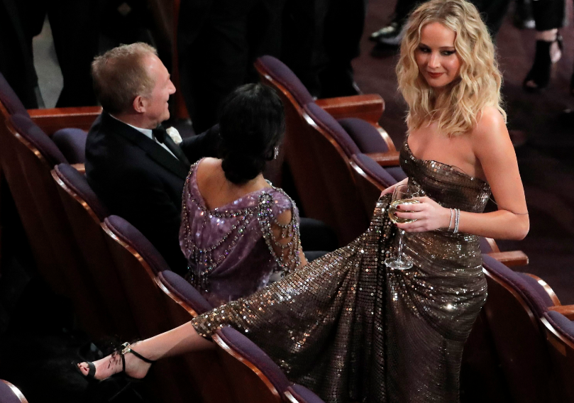 Актриса явно перебрала с алкоголем на вручении "Оскара". Победителей церемонии забудут весьма скоро, и найти счастливчиков, получивших заветные статуэтки, можно будет лишь в Википедии. А вот отличившуюся Лоуренс будут вспоминать еще долго. Во время церемонии девушка увидела своих друзей и, не желая терять ни минуты, отправилась к ним прямо через кресла в зале. Не помешало ей и узкое в пол платье. Стоит отметить ловкость певицы: ей удалось ни пролить ни капли шампанского из бокала, с которым она, кстати, не расставалась. Пользователи сети с юмором отнеслись к девушке, и она быстро стала героиней мемов.