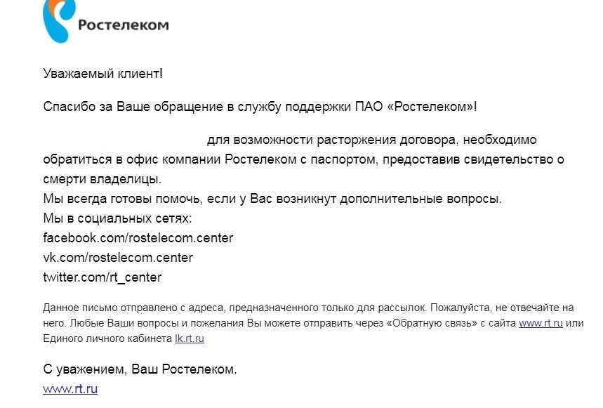 Недавно (в январе) у меня умерла бабушка. Два месяца до смерти она провела в больнице, в платном отделении, т.к была совсем плоха (было ей почти 98), там же, в больнице её не стало. Последние несколько лет я оплачивал её платёжки, покупал лекарства, возил продукты, оплачивал больницу и т.д. И вот, в феврале, ЖСК озадачило меня тем, что оказывается, находясь в больнице, при смерти, моя бабушка якобы подключила себе кабельное телевидение от Ростелеком. Это, мол, "выявила ревизионная проверка" Ростелекома! Похоже в правлении ЖСК сами были в шоке от такого фокуса, т.к. прекрасно знали, где находилась моя бабушка. Но "прикол" не только в том, что её не было дома 2 месяца перед смертью, а и в том, что у неё и телевизора-то не было последние лет 20 (если не больше). Не любила она этот, как она его называла, "говноящик".