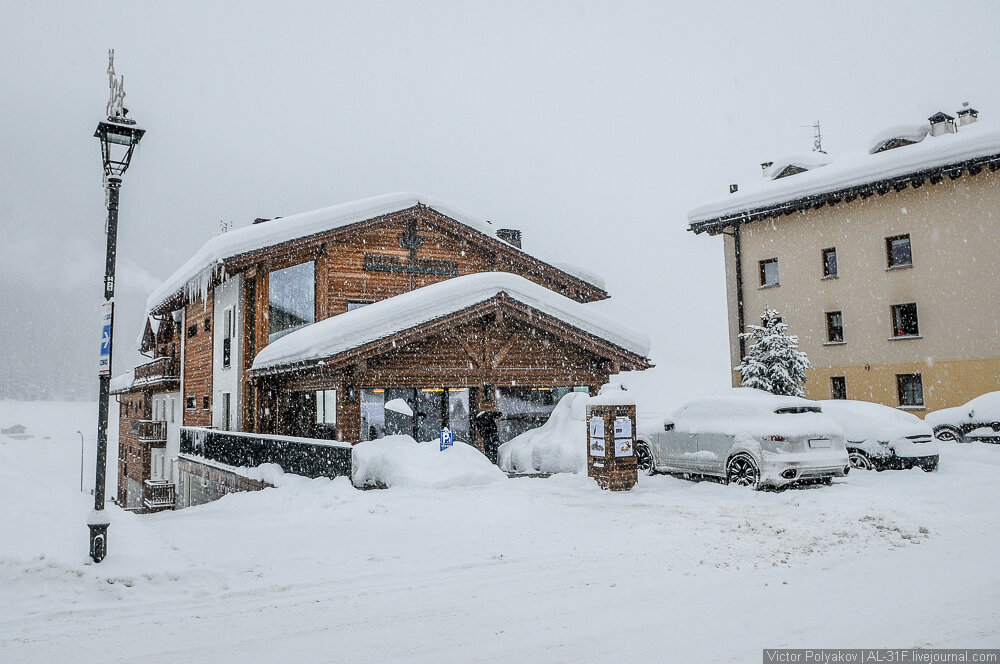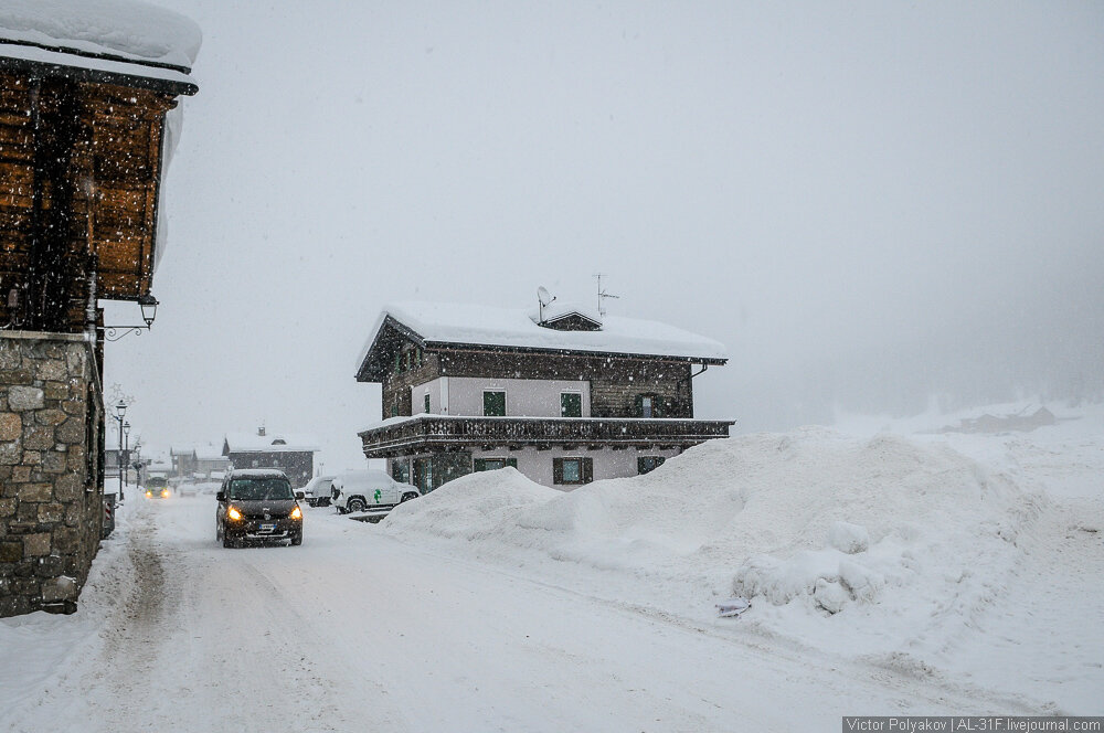 По утрам мы бегали на лыжах вдоль речки, потом выпивали бокал вина, завтракали и отправлялись на горнолыжные склоны. Иногда, правда, в те моменты, когда остальную Европу сносило ветром и смывало наводнением, подъёмники у нас не работали, и мы гуляли по деревне к ближайшему дьюти-фри за очередной бутылочкой вина. Видимость была никакущая, но я всё равно один раз взял с собой на прогулку камеру.