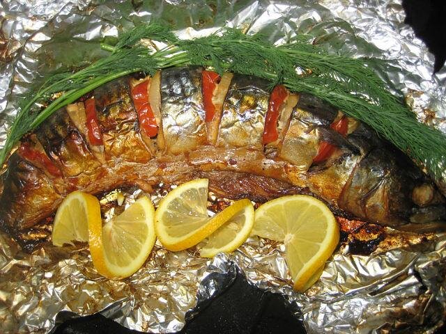 Сытный ужин. Ингредиенты: Скумбрия 1 шт. Помидор 1 шт. Лук репчатый 1 шт. Лимон 30 грамм Соль, перец по вкусу Приготовление: Почистить и промыть крупную скумбрию. Рыбку нарезать на порционные кусочки, немного не дорезая до конца (чтобы рыба не распалась на отдельные куски). Положить в каждый разрез кружочек лимона, кружочек помидора, кружочек лука. Посолить и поперчить рыбку. Завернуть в фольгу и отправить в духовку запекать до готовности (25-30 минут). Приятного аппетита.