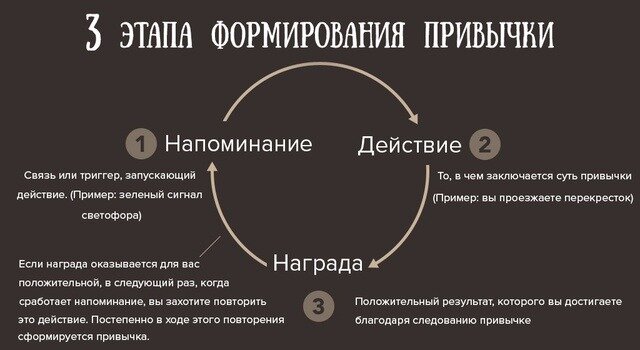 Есть такая теория,чтобы привить в себе привычку к чему либо, нужно выполнять это в течении 21 дня. Но почему например, приобрести привычку курить в течении этого времени просто, а вот чтобы произвести обратную манипуляцию, этого времени бывает не достаточно. Та же закономерность наблюдается и в аналогии с питанием и физическими упражнениями. Одни привычки мы приобретаем легко, не прорабатывая их в своём мозгу, а другие требуют не только времени, но и титанических усилий. Особенность процесса формирования привычки в том, что наш мозг выбирает для автоматического исполнения не только полезные или желаемые нами привычки (делать зарядку, закрывать за собой дверь, умываться), но и бесполезные и порой «вредные», то есть ненужные для нас (пить чай со сладким, курить в напряжённой ситуации, валяться у телевизора, когда скучно). Главный критерий выбора мозга для формирования новой привычки — это так называемое вознаграждение — ощущение, которое возникает при совершении какого-либо действия.
