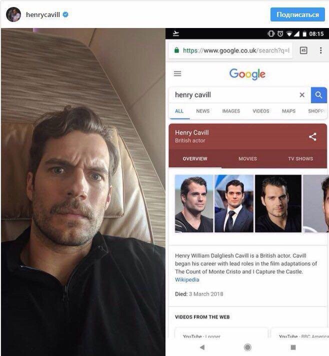 Твоё лицо, когда узнал, что умер еще 2 дня назад. Генри Кавилл, звезда фильмов по комиксам DC обнаружил, что Google приписал ему дату смерти – если бы вы ввели имя Генри Кавилла в поисковике, тот бы выдал, что актер, оказывается, умер 3 марта. Сейчас ошибка исправлена, Генри не обижен.