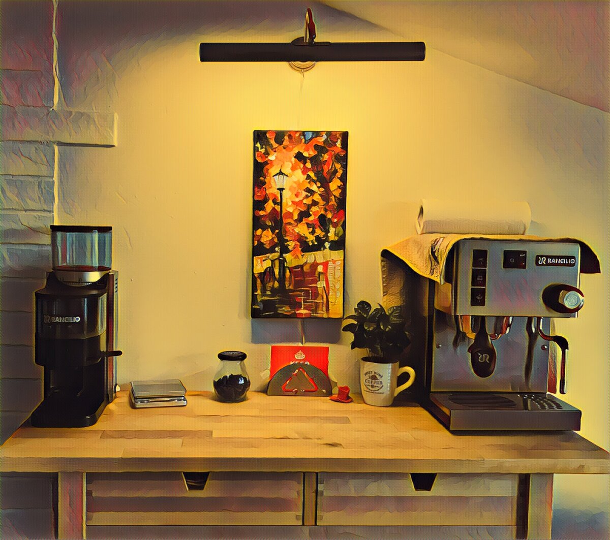 Кофейная станция (coffeesatation) содержит кофеварку, кофемолку, темпер, питчер, кружки для эспрессо и латте/капучино, весы (точность до 0,1 грамма). Кофеварка содержит портафильтр с корзиной для кофейной таблетки, щётка для чистки группы пролива. Для удобства могут добавляться коврик или подставка для темперовки, несколько портафильтров (бездонник, с разадчей на одну и две чашки), набор сменных корзин под таблетки разного веса, набор темперов и трихтеров в соответствии с корзинами, несколько питчеров разного объёма, мерки для готового напитка или для его ингредиентов. Каждая кофейная станция неповторима, так же как каждый шот эспрессо. Если бариста любит заваривать кофе альтернативными способами, то кофейная станция становится похожа на стол алхимика, а процесс приготовления иногда напоминает процесс получения философского камня. Фантазия бариста в обустройстве не ограничивается только необходимым оборудованием. Аксессуары и элементы декора подбираются хозяином как правило исходя из