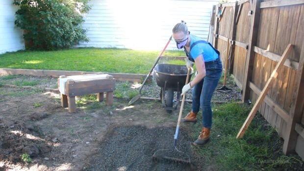 Первым делом размечается участок, снимается верхний слой грунта и укладывается геотекстиль, после чего засыпается мелким гравием.