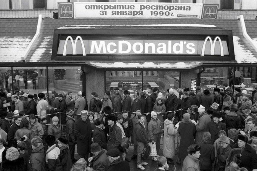 Первый ресторан из знаменитой сети "МакДональдс" был открыт ещё 31 января 1990 года, при Горбачёве, что неудивительно. Это было сделано с разрешения Коммунистической партии СССР, это был первый "фаст-фуд" в Советском Союзе, и в первый же день работы ресторана, стал легендарным, попав в книгу рекордов Гиннесса, ведь в день открытия сотрудники первого "МакДональдса" накормили более тридцати тысяч советских граждан. Этот ресторан стал буквально достопримечательностью, там регулярно выстраивались сумасшедшие очереди как из "местных", так и из туристов, которые, съезжаясь в столицу из разных регионов, считали своим долгом посетить данное место, и устроить возле заведения очередь в несколько тысяч человек. Советские граждане до этого никогда не пробовали гамбургеров и прочих прелестей, являющихся обыденными вещами на Западе, и не смотря на то, что цены там были слишком уж высокими, постоянно толпились у входа. Диковинная еда и высокий уровень обслуживания поражал людей, это было совсем