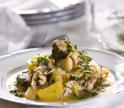 5 средних картофелин Приготовление: 1. Баранину вымойте и нарежьте на небольшие куски. 2. Залейте мясо водой, поставьте на огонь, дайте жидкости увариться. 3. Всыпьте муку, соль, перец, добавьте часть петрушки и тимьяна, лавровый лист, мелко нарезанный чеснок, размешайте. 4. Добавьте воду так, чтобы она покрыла мясо и приправы, и варите на слабом огне 1 час 20 минут. 5. Вымойте, почистите и нарежьте лук кубиками, а репу — дольками. пассеруйте их на сковороде до золотистого цвета, добавив сахар, соль и говяжий жир. 6. Картофель почистите, нарежьте небольшими ломтиками и обжаривайте на сковороде 8-10 минут. 7. Добавьте к мясу пассерованные овощи и жареный картофель. перемешайте и туш