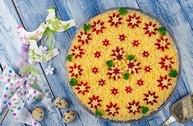 Нам понадобится: Способ приготовления: 1. Сразу скажу, что в этот вид многие добавляют еще куриные яйца. И так, вскройте консервированную кукурузы и с нее слейте сок. С ананасами проделайте тоже самое и порубите их на небольшие кусочки, если вдруг они у вас были колечками. Далее на мелкой терке натрите сыр, курицу порежьте ножом или разорвите на волокна. Заправьте майонезом и дайте постоять в холодильнике пару часов настояться. 4. Ну, а можно тертый сыр поместить на верх, и оформить зеленью и различными фигурками, которые будут напоминать цветочки, их можно сделать из болгарского перца или кожуры помидора