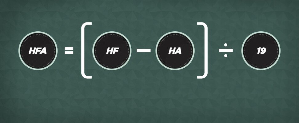 Чтобы вычислить показатель преимущества домашнего поля команды, отнимите от количества забитых голов за сезон (HF) количество пропущенных голов на своем поле (HA). А затем разделите на количество домашних матчей, также сыгранных за сезон (19):