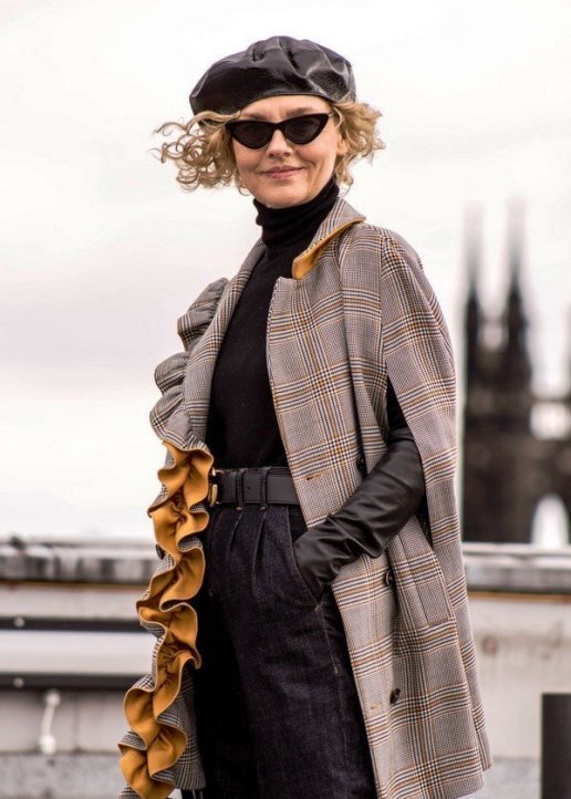 Не только молодые девушки могут стать иконой стиля в интернет-пространстве. Англичанке Renia Jaz уже за 50, но ее блог, названный в честь мужа и посвященный моде и красоте для дам зрелого возраста, с удовольствием читают посетительницы со всего мира. Посмотрите, какие образы предлагает она в этом сезоне. Вы совершенно ошибаетесь, если считаете, что женщинам в определенном возрасте не пристало следить за модными тенденциями. Вовсе не обязательно облачаться в безликие мешки, стараясь привлекать к своей внешности как можно меньше внимания, и оставив молодым женщинам привилегию делать прическу и макияж. Практически все модные тенденции применимы к любому возрасту, если правильно расставлять акценты и выбирать сочетание длины, фактуры ткани и цветов. Посмотрите на это сочетание брюк из темной джинсовой ткани с ремнем в стиле милитари и строгого кейпа в горчично-серую клетку – здесь собраны все новые веяния текущего сезона. Черные длинные кожаные перчатки и берет из черной кожи – и перед ва