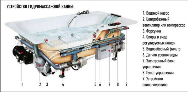 От привычной стандартной ванны гидромассажная отличается тем, что оно снабжена системой гидромассажа, включающей водозаборник, центробежный насос, гидромассажные форсунки. Принцип действия сантехнического прибора таков: при работающем насосе вода из ванны подается в водозаборник, из которого она прокачивается через специальные трубы и под давлением поступает в форсунки, снабженные соплом, через которое вода выбрасывается в ванну.