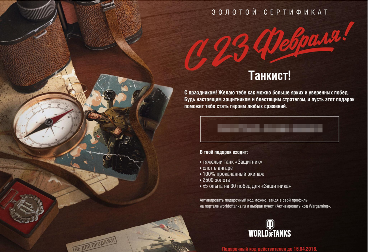 Создатели World of Tanks в этом году решили порадовать и удивить свою игровую аудиторию - 23 февраля каждый игрок может получить совершенно бесплатный сертификат на один из танков. Сертификат можно активировать только 23 числа, поэтому обязательно зайдите в этот день в игру. Разработчики создали три сертификата: Объект 252У Защитник, СТГ Гвардеец, Т-28Э с Ф-30. Последний сертификат практически бесполезный и он подойдет для тех, у кого уже уже есть первые два танка. А так, что первый, что второй танк очень сильные, обладают замечательным орудием и при правильном применении смогут затащить практически любое сражение. Дабы активировать сертификат необходимо зайти в World of Tanks 23 февраля и сыграть всего лишь один бой. Сами понимаете, это предложение действительно уникальное и такого, скорее всего, больше не будет в нашей игре, поэтому успевайте получить халявный премиум танк.