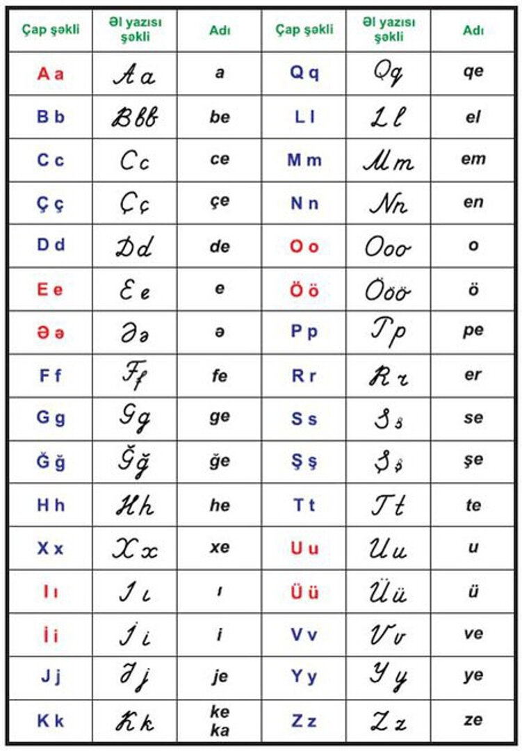 Алфавит в современном азербайджанском языке состоит из 32 букв. Звуков в языке 34. Освоением алфавита мы займемся с первого же урока, для чего я привожу таблицу с буквами современного азербайджанского алфавита. Это латиница азербайджанская, которую не следует путать с турецкой. Особенность азербайджанской латиницы в том, что для знающего английский язык человека здесь будет затруднительно произношение известных букв в новом звучании, поэтому забудьте все ваши познания в английском, чтобы не путаться.