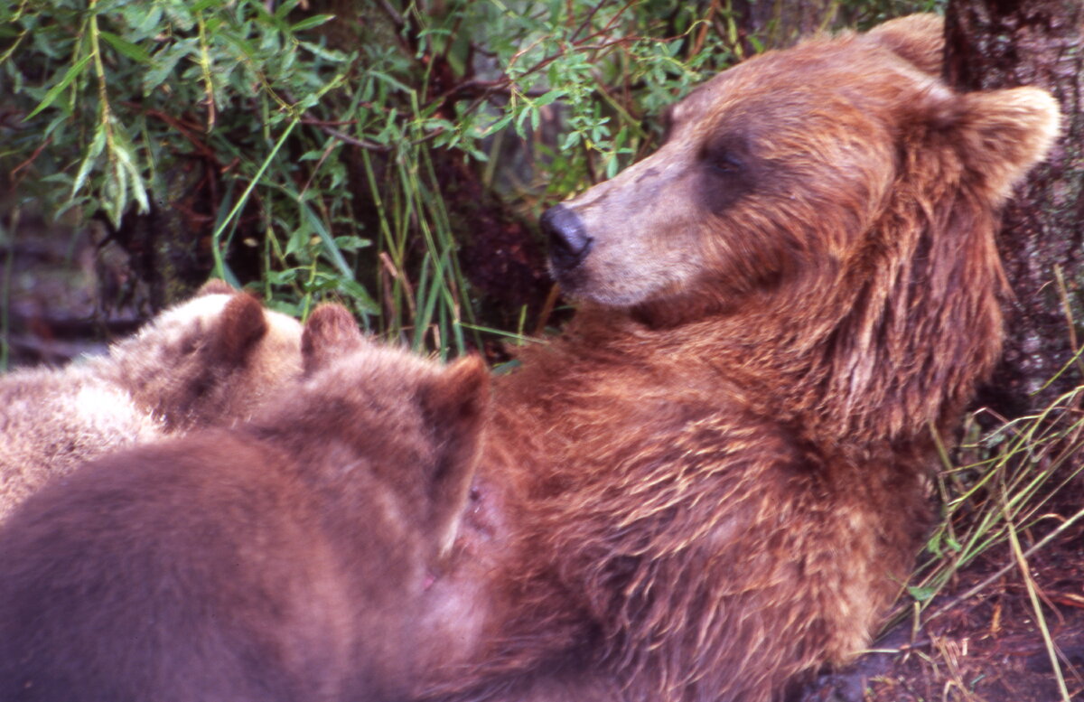 Медведица пришла с низовий реки, где чуть не попала в одну из петель из стального троса, установленных бригадой браконьеров, на подходах к месту, где они потрошили икру из поднимающейся на нерест рыбы. Удобные для рыбалки берега здесь уже были уже заняты другими медведями. Соблюдая дистанцию, медведица сунулась было, туда-сюда, но, предупреждающие взгляды обитателей вынудили её отказаться от намерения попытать удачи здесь. Надо было идти дальше, а два её медвежонка, словно почувствовав это, враз захотели есть. То как медвежата просят маму дать им возможность подкрепиться молоком, это отдельная «песня». Я бы назвал их в этот момент настойчивыми нытиками. Ага, жалостно громко, настойчиво, в данном случае в два голоса. Осмотревшись вокруг, медведица привалилась спиной к стволу прибрежного дерева, вытянула ноги, и медвежата тут же заползли каждый к своей кормушке. Которых у медведицы – две пары сверху и одна снизу. И заурчали усердно, как моторчики, размазывая молоко по брюх