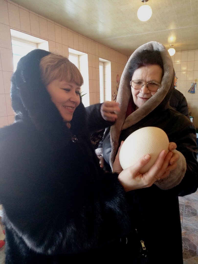 Это настоящее страусиное яйцо. Кстати, яйца у страусов очень крепкие - выдерживают давление до 55 кг. Из одного яйца можно сделать омлет на 30 порций.