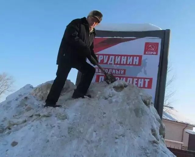 Коммунисты веду войну с коммунальщиками за баннер Грудинина. Коммунальная война развернулась в Переславле-Залесском, Ярославской области вокруг агитационного баннера кандидата в президенты Грудинина. Собранным с улиц города снегом и льдом, неизвестными лицами был засыпан баннер кандидата. «Агитационный билборд стоит на улице Кардовского у бывшего автовокзала — это проходное место. Неделю назад мы обнаружили, что его засыпали, явно при помощи спецтехники — там огромные глыбы льда. Вчера двое наших коммунистов пришли с лопатами и откопали агитацию. Очень тяжелая работа — у одного сердце прихватило, другой был чуть живой. Но сегодня горы снега появились снова. И если в первый раз баннер засыпали наполовину, то теперь практически полностью — гора в три человеческих роста», — сказал корреспонденту ИА REGNUM Александр Дыма. Александра Дымы считает, что власти Переславля-Залесского причастны к закапыванию кандидата в президенты. Однако сами власти это отрицают. Коммунисты же в свою