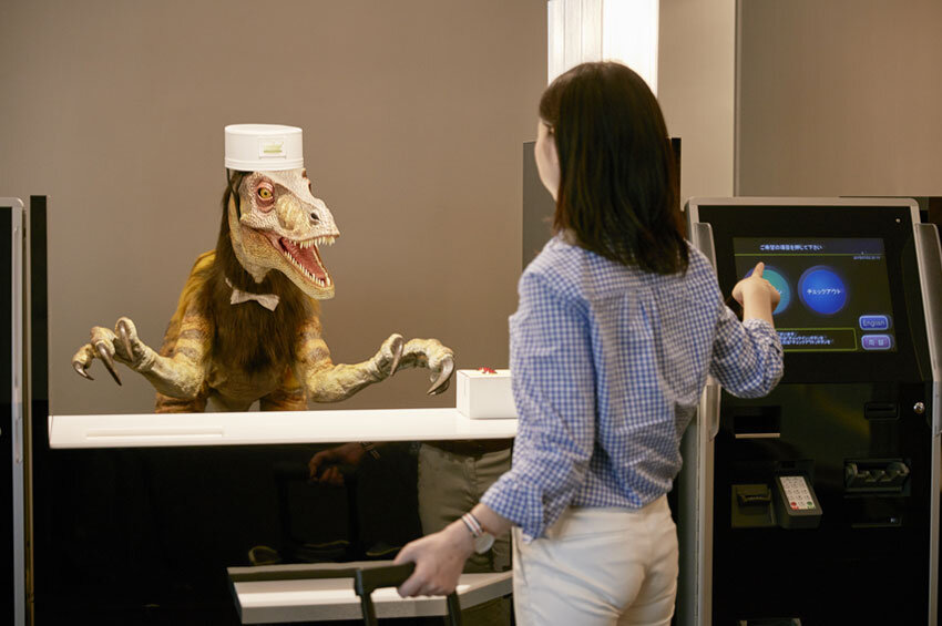Главной изюминкой Henn-na Hotel, несомненно, можно назвать его обслуживающий персонал, функции которого выполняют умелые, доброжелательные и неустанные роботы. Так, уже на ресепшене гостей встречают рободевушка и два роботираннозавра, которые регистрируют постояльцев и могут ответить на простые вопросы. Администратор-гуманоид ориентирован на людей, владеющих японским, тогда как динозавры общаются с англоязычными гостями. Впрочем, постепенно весь персонал переводится на мультиязычные алгоритмы.