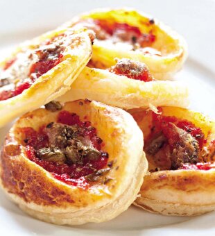 2. Выложить на мини-пиццу томатный соус, немного моцареллы и каперсов, посыпать орегано и слегка полить оливковым маслом.