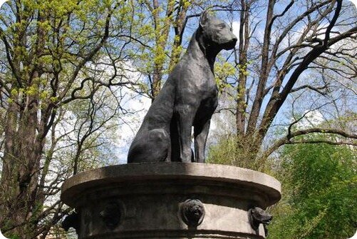 На Аптекарском острове в Санкт-Петербурге, на улице академика И.П. Павлова располагается старый сад. Это парк Института экспериментальной медицины РАМН. Здесь в центре небольшой площадки и находится «Памятник Собаке». Создал его выдающийся советский скульптор, Иннокентий Федорович Беспалов, в одна тысяча девятьсот тридцать пятом году. Концепция же скульптуры принадлежит академику Павлову. Имя выдающегося русского учёного, физиолога, Ивана Петровича Павлова, неразрывно связано с Институтом экспериментальной медицины. Он всегда очень сердечно относился к животным, которые участвовали в научных опытах и экспериментах, служа науке. Памятник представляет собой бронзовый цилиндрический постамент, на котором сидит большой дог и спокойно смотрит на людей. Пьедестал украшают четыре фигурных барельефа. На барельефах изображены некоторые сцены из жизни экспериментальной лаборатории, в которых участвуют собаки. Каждый сюжет сопровождается словами, сказанными когда-то Иваном Петровичем Павловым