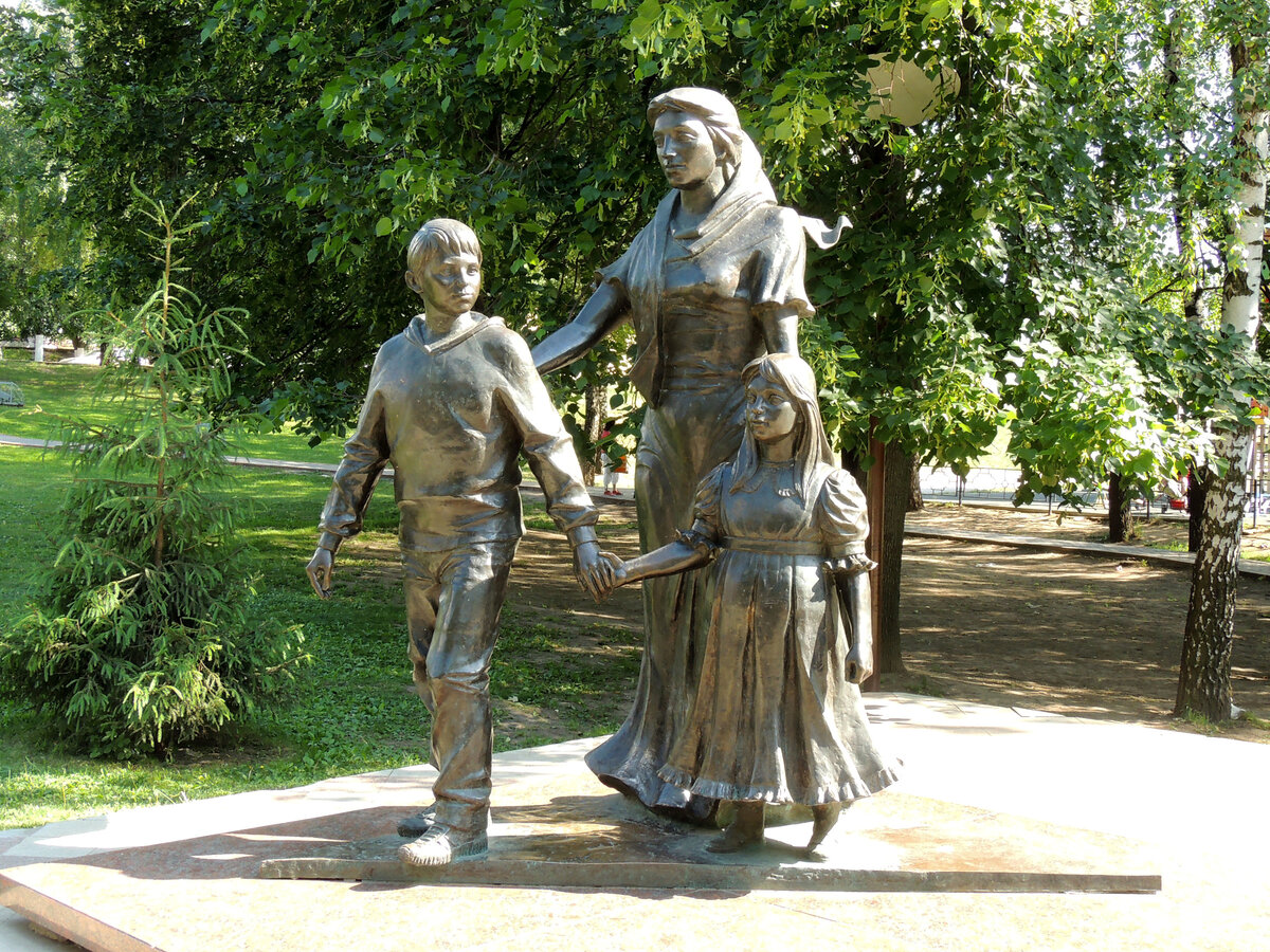 Памятник «Нашим матерям» представляет собой композицию из трех бронзовых скульптур, женщины с двумя детьми. Мальчик и девочка устремились в сторону Храма Георгия Победоносца, а мать за ними еле поспевает. Думаю, что направление памятника было не случайным, тем самым скульптором Александр Рожников хотел показать, что женщинам и детям в годы войны только и оставалось, что переживать за своих родных и молиться. Кроме как верить и ждать им больше ничего не оставалось.