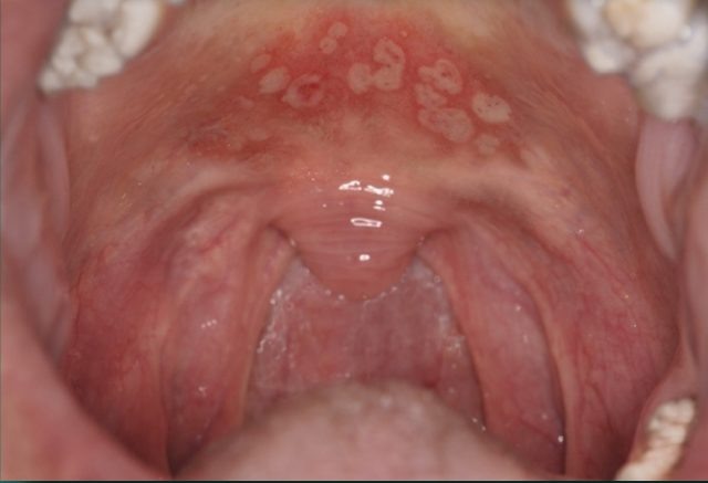 5. Кандидоз. Дети могут иметь данное заболевание в связи с ослабленным иммунитетом. Такой вид покрывает полностью ротовую полость. Появляется в горле белый налет и на миндалинах, но он совершенно не беспокоит ребенка.