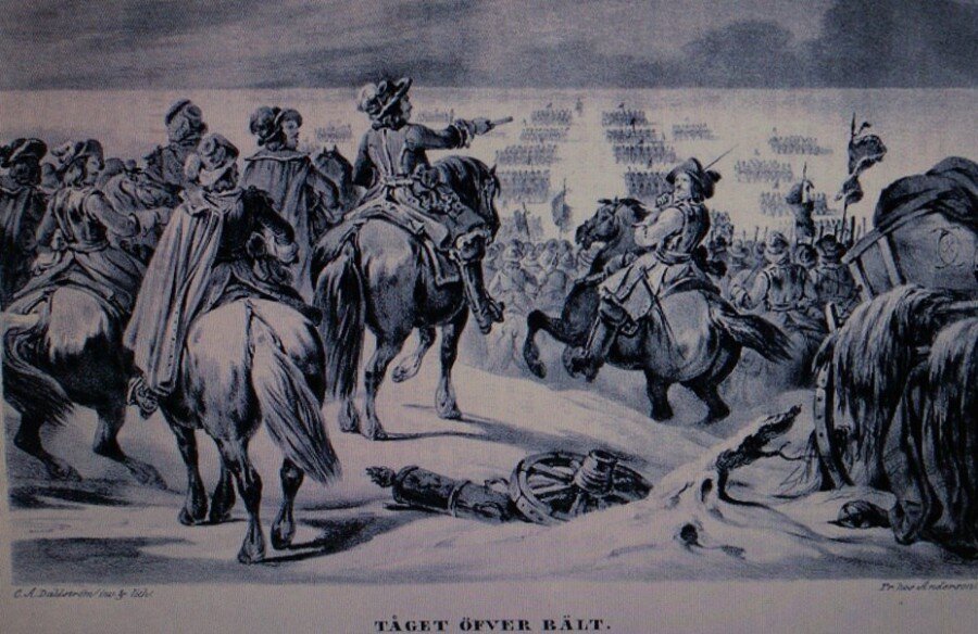 30 января 1658 года 12 тысячная армия отправилась пешком из Швеции в Данию по воде аки посуху, то есть на самом деле по льду, который, как оказалось, местами был все-таки не таким уж толстым. Часть народа провалилась, но большая часть перешла пролив Малый Бельт и сшибла заслон из трех тысяч датчан на острове Фюн.