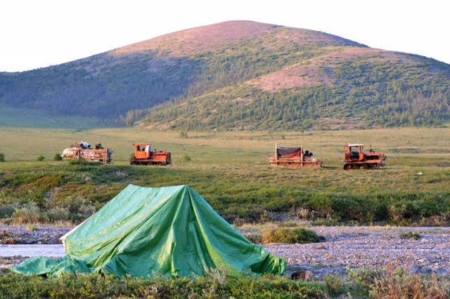 Стан оленеводов расположился в трех километрах выше по реке. Пару дней назад они проехали мимо нашего лагеря, вместе со своим скарбом, на двух прицепных санях буксируемых тракторами. Их бригадир, дядя Миша, перейдя реку вброд, зашел к нам, попить чайку. Мы уже встречались с ним на базе оленеводов, официально не существующем на карте Чукотки поселении Бургахчан. А вообще, они двигаются в самые верховья одноимённой с селением реки, на летние пастбища.
