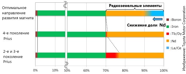 Источник: Toyota Motor Corporation Toyota Motor Corporation объявила о создании первого в мире термостойкого магнита с пониженным содержанием неодима (Nd). Постоянные магниты из неодима используются в различных типах двигателей, в том числе в высокомоментных моторах для электромобилей. До половины неодима в новом магните заменяется на другие редкоземельные металлы - лантан (La) и церий (Ce), которые на порядок дешевле. Неодим играет важную роль в поддержании высокой коэрцитивности (способности удерживать намагниченность) и термостойкости магнита. Предыдущие попытки использовать лантан и церий приводили к снижению характеристик электродвигателя, новые технологии позволили сохранить термостойкость и эффективность двигателя даже при 50% уменьшении количества неодима. Вдобавок, в новом магните не используются тербий (Tb) и диспрозий (Dy), применяемые ранее для повышение температурных свойств магнитов. Эти редкозмельные металлы также относятся к дефицитным материалам. Цена маг