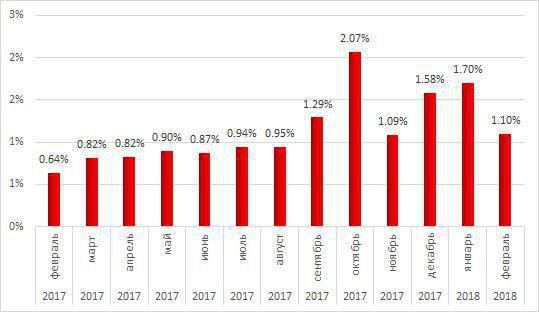 По данным Лаборатории Касперского, доля промышленных компьютеров (автоматизированных систем управления на предприятиях), заражённых вирусами-майнерами. Как видно из графика, более 1% промышленных компьютеров, заражены скрытыми майнерами.