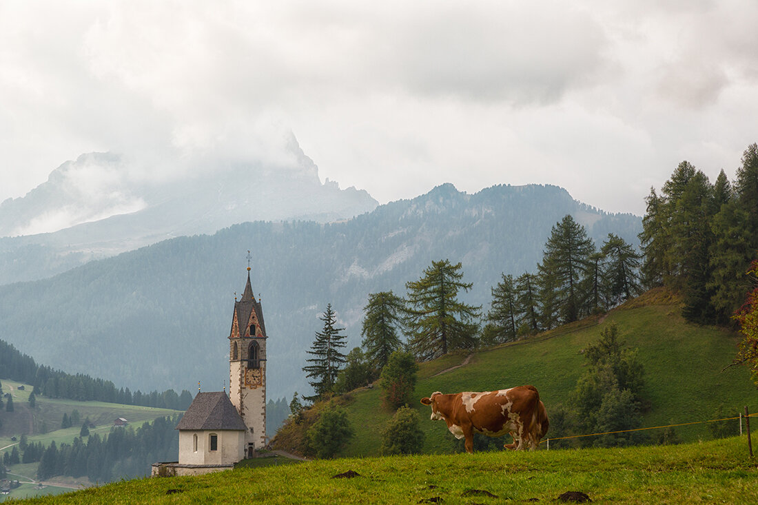 Горы, небольшая церковь, коровки и маленькая деревушка в горах - практически рекламная картина. Не хватает только фиолетовой коровы, которая всех делает счастливыми.