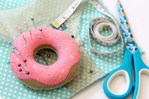 Изготовление полезных игрушек и сувениров – отличный способ сблизиться со своим ребенком, с раннего возраста приучить его делать добро, проявлять заботу о родных людях. Узнать, как сделать игольницу пончик своими руками, трудиться вместе с мамой будет интересно каждому маленькому мастеру. Тем более что красивая игольница наверняка пригодится для подарка бабушке в честь дня рождения, на Новый год или 8 Марта. Кроме того, мягкий яркий «пончик» можно использовать в качестве игрушки для малыша. Инструменты и материалы И так, приступим! Нам понадобится: Мастер-класс: 6 простых шагов Шаг 1 Обводим мелком или мылом выкройку, вырезаем 2 ровных коричневых кружка и 1 фигурный из розового фетра для создания глазури. Шаг 2 Украшаем фигурную деталь небольшими стежками «вперед иголку» голубыми, желтыми и белыми нитками мулине, имитируя присыпку. Шаг 3 Накладываем розовую «глазурь» на коричневый кружок, прикалываем булавками, пришиваем простым стежком «через край» либо более сложным петельным швом.