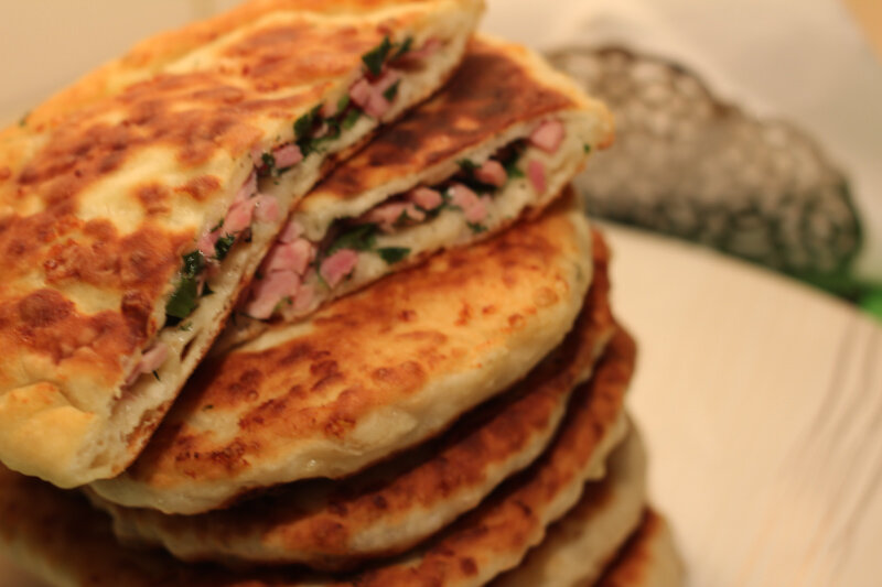 Очень простой и быстрый рецепт лепешек к чаю, который можно приготовить к завтраку или если внезапно нагрянули гости. Несмотря на то, что придется замешивать тесто, в целом блюдо готовится несложно. Список продуктов: Как готовить Сыр натрите на крупной терке. Ветчину нарежьте кубиками или тоже натрите. В кефир добавьте соль и соду, перемешайте. Также добавьте тертый сыр и муку, замесите тесто. Разделите тесто на равные части, каждую раскатайте. Делать лепешки можно круглой или квадратной (прямоугольной) формой. Если разделили на большие части, то на одну половинку выложите часть ветчины, второй накройте сверху и защепите края. Если кусочки теста небольшие, на один выложите начинку, сверху положите второй и защипите края. Жарим на сковороде по 2-3 мин с каждой стороны. Рецепт универсальный, помимо ветчины можно использовать другие начинки - творог, фарш, грибы и т.д. Не забудьте подписаться, если идея Вам понравилась! Готовим вкусные блюда на скорую руку. Рецепты за 5, 15 или 30 минут