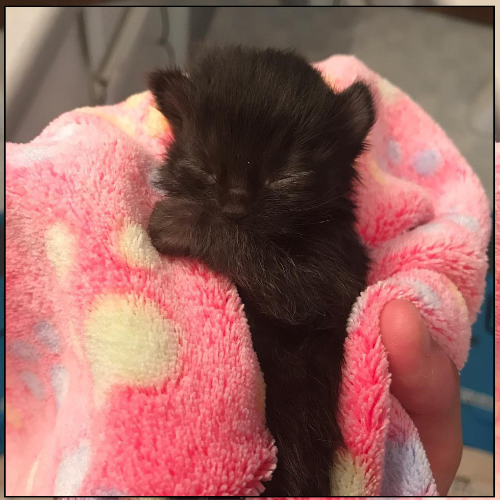 После недавнего урагана в США, появилось очень много бездомных животных. Маму кошку с маленьким котенком нашли на улице и сразу отправили в приют. Ее котенок хоть ему было уже почти две недели, был размером с новорожденного, у него даже не отпала пуповина. Эту малышку назвали Микой. Хоть Мика уже и открыла свои глазки, но еще не могла питаться сама. Главная проблема была в том, что у кошки мамы от стресса кончилось молоко. Эта очаровашка постоянно звала свою маму, а она к ней даже не подходила. Мы стали кормить этого котенка сухим заменителем кошачьего молока. Мика была так голодна, что даже не обращала внимание на вкус, а жадно пила. Я кормила Мику по часам, вставая по будильнику даже ночью. Мика кушала как богатырь и начала поправляться. На третью неделю у нее только отпала пуповина. Что бы защитить ослабленное животное, я сделала котенку свитерок из своих старых носков. Мики очень привязалась ко мне, и ходила за мной по пятам. Я взяла на передержку котят ее возраста, ей очень понрав