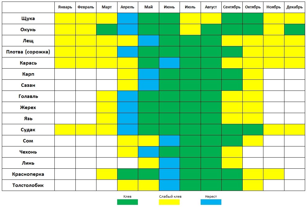 Каждый рыболов хочет знать повезет ему сегодня на водоеме или нет. Несмотря на то, что люди уже летают в космос и видят собеседника на другом конце планеты не выходя из дома, предсказать точный исход рыбалки невозможно. Но многовековые наблюдения и опыт любителей ловли позволяют сделать выводы о поведении рыб в разное время года. Здесь представлен обобщенный календарь клева. Он дает общее представление о периоде клева и нереста различных видов рыб, обитающих в водоемах России, Украины и Республики Беларусь. Основное влияние на их поведение оказывает температура воды и атмосферное давление. Обращаясь к данному календарю помните, что в южных регионах, нерест начинается раньше, а в северных позже. Его продолжительность тоже может быть различная: у некоторых видов рыб 2-3 дня, у других до месяца с учетом посленерестовой «болезни».