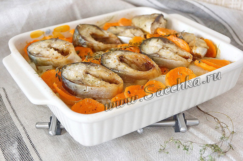 - Форму для запекания смазать маслом. Положить нарезанный картофель, на него вылить стакан горячей воды с растворённой солью. На картофель положить кольца лука, затем кусочки рыбы, чередуя с кружками моркови. Сверху посыпать приправами, солью, тимьяном и полить растительным маслом.