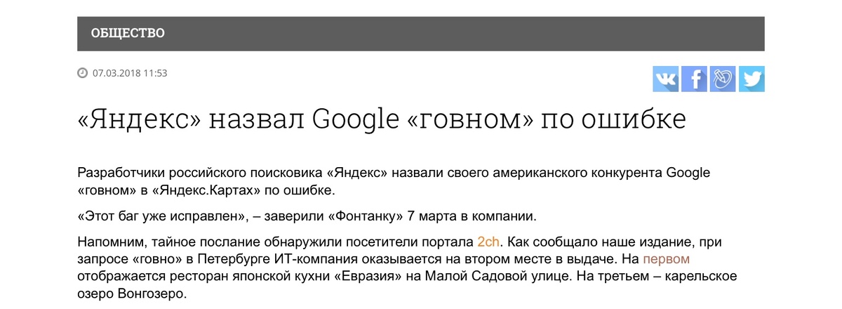 Интернет издание «Фонтанка» пишет, что Яндекс.Карты показывали адрес офиса Google при поиске одного не очень хорошего слова по ошибке. И утверждает, что в Яндекс эту ошибку исправили. До признания ошибки поиск в картах выглядел вот так: Ну, а после вот так: Значит «Фонтанка» верно пишет. Теперь Google в поиске этого слова вам не предлагают. Но что с «Евразией»? Выходит с ними нет ошибки? Мой ЖЖ: 4tonetak.livejournal.com Мой Instagram: instagram.com/4tonetak Трансляция моего ЖЖ в Telegram: t.me/LJ4tonetak
