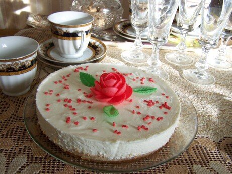 Есть у меня любимый рецепт вкусного и легкого тортика. Он делается за 20 минут из продуктов, которые всегда можно найти на кухне и в холодильнике даже у не очень активной хозяйки. Разве что придется купить упаковку готовых коржей. Что немаловажно в канун 8 Марта, его может сделать любой мужчина и даже ребенок. Делюсь рецептом реактивного чизкейка. Достали из холодильника и шкафчиков: 300 г обезжиренного или маложирного творога, 2 пакетика ванильного сахара (по 10 г), пакет желатина (40 г), лимон, 200 г сахара, 400 мл сливок (30%). Ну и корж диаметром 24 см, который сразу пропитайте глинтвейном или любимым ликером. На тарелку ставим разъемную форму для выпечки без дна, кладем в нее корж. Желатин заливаем 180 мл воды, через 15 минут ставим на водяную баню и нагреваем до полного растворения (до кипения не доводить!). Добавляем в него 100 г сахара и хорошо размешиваем. Творог, 50 г сахара, ванильный сахар, цедру лимона и 4 столовые ложки лимонного сока взбиваем миксером. Теплый желатин