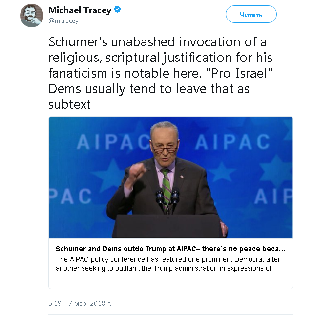 "Бесспорное обращение Шумера к религиозному, библейскому оправданию его фанатизма примечательно здесь. "Произраильские" демократы обычно имеют тенденцию оставлять это как подтекст"