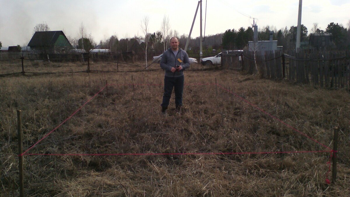 Начать строительство дома я решил со строительства сеней. Сени, если вдруг кто не в курсе, это такая небольшая пристройка к дому. К этому решению я пришел так: сперва я хотел построить бытовку-времянку с последующим сносом, потом времянка в моих фантазиях превратилась в гостевой дом и только потом стала сенями. Я подумал, что нет смысла строить на участке два дома, если есть возможность построить пристройку к дому вперед, собственно, дома. Кроме того, если соблюдать строительные нормы и правила (они же СНИПы), то на участке размером менее 10 соток сложно уместить два жилых строения сколь-нибудь подходящей для комфортного проживания площади. В итоге, я решил строить один большой дом по частям и, как уже говорилось выше, начал с сеней. Нарисовав на бумажке примерный план моего будущего строения, я взял красную тесемку, рулетку, наточил несколько колышков и начал переносить все наружные размеры непосредственно на землю. (на фото я стою в границах будущих сеней) Кстати, процедура оказал
