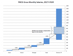 Самый сложный переход в системе FMCG – от менеджера среднего звена (это может быть глава одного из направлений департамента) с зарплатной вилкой 200-300к к Директору. Обычно именно на этой стадии остается большинство середнячков. С одной стороны, в FMCG почти не существует политики up or out, поэтому сидеть на одной позиции можно долго. С другой – растут быстро те (как и везде), кто проактивен и способнее своих коллег на 1-2%. Обычно этого хватает, чтобы преуспеть.