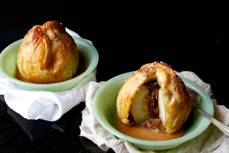 Запеченные яблоки люблю с детства, но вид запеченного яблока как-то уже поднадоел. Пришла мысль одеть его в шубку из теста. Сегодня к чаю запечём яблоки в тесте. Ингредиенты - 4 яблока - 100 гр. клюквы - 4 ст. л. сахара - 10 гр. (слив. масла для смазки) Для теста: - 150 гр. слив. масла - 1 стакан муки - 150 гр. сахара - 2 яйца Для сиропа: - 3 стол. ложки сахара - 100 гр. яблочного сока Способ приготовления Всегда проверяйте яйцо на свежесть. Свежее яйцо опущенное в стакан с водой тонет, не свежее всплывёт. Теперь замешиваем тесто. Яйцо взбиваем, добавляем растопленное сливочное масло, сахар, перемешиваем и всыпаем просеянную муку. Вымешиваем тесто и оставляем его минут на 30. Затем тесто делим на 5 частей, четыре одного размера, а пятый на половину меньше. Из пятого кусочка теста будем вырезать листики, для украшения мешочков с яблоками. Каждый из четырёх кусочков теста раскатываем на квадрат такого размера, чтоб в него завернуть яблоко в виде мешочка. Для приготовления сиропа ябло