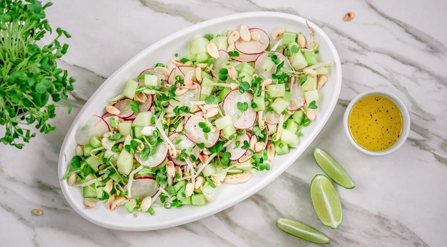 Итак, для приготовления куриного салата оригинального с дыней и редиской понадобятся такие компоненты как: