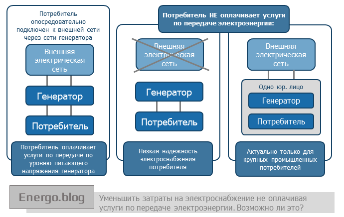 Доля услуг по передаче электроэнергии в конечной стоимости электроснабжения потребителей, подключенных к сетям территориальных сетевых организаций составляет 40-75% (в зависимости от уровня напряжения). То есть доставка электроэнергии до конечного потребителя чаще всего стоит дороже, чем ее производство.Естественно, потребители, особенно крупные, ищут возможность не оплачивать услуги по передаче электроэнергии и тем самым сэкономить значительные денежные средства.