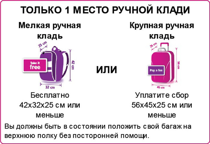 Согласно законодательству РФ, каждый авиаперевозчик сам определяет лимит размера и веса неоплачиваемой ручной клади (но не меньше 5 кг). Авиакомпания устанавливает список предметов, которые запрещено брать с собой в салон. «Аэрофлот» увеличил максимальные габариты ручной клади до 55 см в длину, 40 см в ширину и 25 см в высоту. У большинства других российских перевозчиков высота ручной клади ограничена 20 см, что вызывает огромное недовольство среди пассажиров со стандартными кейсами, фотосумками и кофрами 23-25 см в высоту. «Уральские авиалинии» разрешают бесплатно провозить сверх нормы хрупкие предметы, такие как зонтик, телефон, фотоаппарат, планшет, но запретили брать на борт смартфоны Samsung Galaxy Note 7 из-за случаев возгорания этих гаджетов. Таких же правил придерживается Red Wings и несколько других авиакомпаний. Самые строгие правила у «Победы» – габариты всей ручной клади ограничены 36х30x27 см, за перевоз не вписывающихся в рамки предметов придется доплатить заоблачную сум
