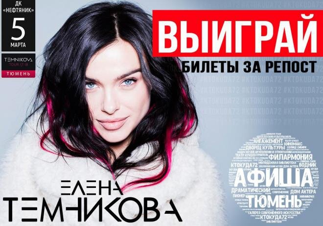"Афиша Тюмень | КтоКуда72" проводит розыгрыш двух билетов на концерт известной российской исполнительницы Елены Темниковой. Победителя определят 4 марта, накануне ее выступления в Тюмени. Чтобы стать участником розыгрыша, необходимо быть подписчиком сообщества "Афиша Тюмень | КтоКуда72" в соцсети "ВКонтакте" и сделать репост конкурсной записи. Одного победителя определят с помощью генератора случайных чисел, он получит два билета и сможет насладиться незабываемым шоу вместе с близким человеком. Концерт Елены Темниковой состоится в Тюмени в ДК "Нефтяник" (ул. Осипенко, 1) 5 марта в 18:00. Команда лейбла TEMNIKOVA подготовила для своих зрителей грандиозный праздник и шоу. Уникальные танцы и хореография, световое и анимационное шоу. Приобрести билеты можно на сайте: https://vk.cc/7LvMNQ. Елена Темникова — популярная российская певица, автор многочисленных хитов ("Импульсы", "Вдох", "Давай улетим", "Ревность", "Не обвиняй меня", "Тепло", "Движения" и др). Одна из самых востребованных арт