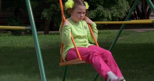 В серии «Качели» упитанная девочка с бантиками никак не соглашается пойти поиграть с мальчиком. С угрюмым видом она сидит на качельках, пока парнишка носится вокруг неё и уговаривает на совместные приключения. Когда он окончательно её достанет («Почему? Ну почему ты не хочешь?»), она выпалит: «Застряла я!». Любопытно, если бы не этот неугомонный человек, сколько бы девочке пришлось так молча сидеть, стесняясь признаться в ужасном: она толст… нет, её размер больше среднего, и качельки спроектированы, видимо, не для неё.