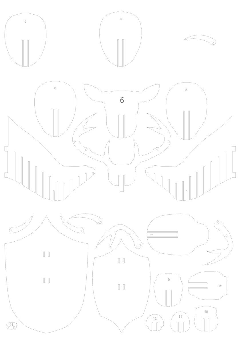 Захотелось немного поработать лобзиком.Нашел в интернете эскизы деталей для сборки головы Оленя (на самом деле эскизов много разных животных, надо просто хорошо поискать). Сразу скажу, что лучше всего детали вырезать на ЧПУ лазерном станке. Не будет сколов и геморроя.Но во-первых я хотел сделать из толстой фанеры 10 мм, во-вторых я хотел сделать сам, стло интересно. Это эскизы (отредактированы мной): Распечатал эскизы на формате А0, мне растянули изображение пропорционально под размер листа: Исходник я изменил, так как в оригинальном были ошибки.Неправильно был выбран паз на одном из рогов, также почему то присутствовала лишняя деталь): Вырезаем ножом: Берем фанеру, размечаем все детали: Но я не учел одного, что эскизы были для 4 мм фанеры, и пазы соответственно тоже шириной 4 мм. Пришлось все пазы перерисовывать под 10 мм: Приступаем: Через 2 часа было все готово: Издержки "производства": Сначала нужно было обработать все детали наждачкой, убрать заусенцы, также пазы дото