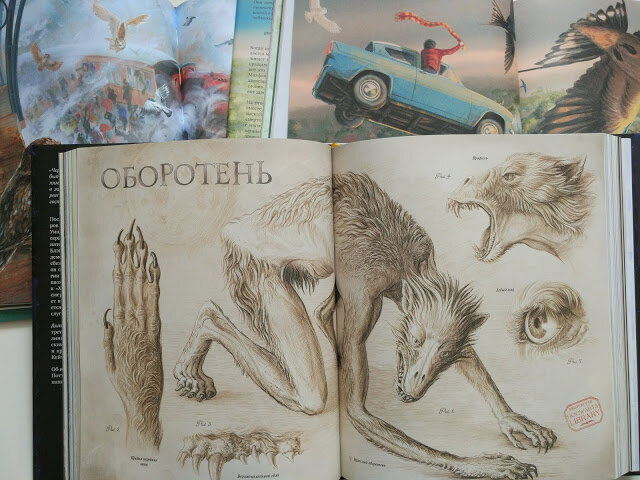 Книги мне особенно понравились тем, что даже если на развороте нет картинок, текст напечатан на красивом акварельном фоне, добавлены штрихи или, например, след от чашки с кофе. В общем, красива каждая страница. Особенно мне нравятся развороты со сказочными существами (Тролль в первой части, Феникс во второй, Оборотень, Загрыбаст - в третьей).