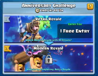 В честь двухлетия игры любителей клеш рояль ожидает новое(нет) испытание в Clash Royale! Новое оно потому, что начнется завтра. А старое т.к. всем нам, любителям рояля, давно знакомо. Состоять оно будет из двух этапов - 1 ретро рояль и 2 рояль модерн. Если кто не знает, не помнит - ретро рояль это испытание картами, которые были в самом начале игры, при её релизе. Тут мы должны набить 10 корон для перехода ко второму этапу. Количество проигрышей не ограничено. А принесёт оно нам 1000 халявного золотишка.. Не густо, но пригодится! Вторым этапом нас ждёт игра тольно новыми, точнее вышедшими после релиза игры, картами. С правом на три проигрыша, надо одержать шесть побед, чтобы получить эпический сундук + 600 голды, 25 карт - это гарантированный сундук, ну по пути к шести победам нам насыпят 50 бочек со скелетами, 25 мини тесл и 3 эпических охотника. Согласен, не так уж это все круто - зато бесплатно =) Так что спс илка Но не одним испытанием мы отметим два года любимой игры.. Н